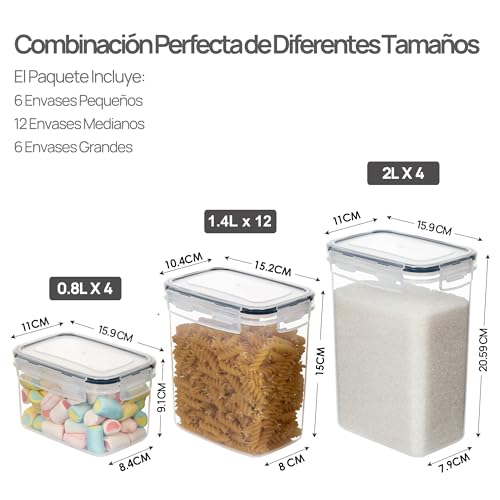 Combinaciones de 4 tamaños que se adaptan a tus necesidades: nuestro juego de recipientes de almacenamiento de cocina viene en 4 tamaños diferentes. Incluye 2 recipientes altos (2.5 cuartos / 2.8 litros), 10 recipientes grandes (1.8 cuartos / 2.0 litros), 10 recipientes medianos (1.5 cuartos / 1.6 litros), 10 recipientes pequeños (0.7 cuartos / 0.8 litros). Perfecto para guardar espaguetis, suministros de horneado, cereales, harina, azúcar, avena, pasta, arroz, café, té, aperitivos, nueces y otros productos secos.