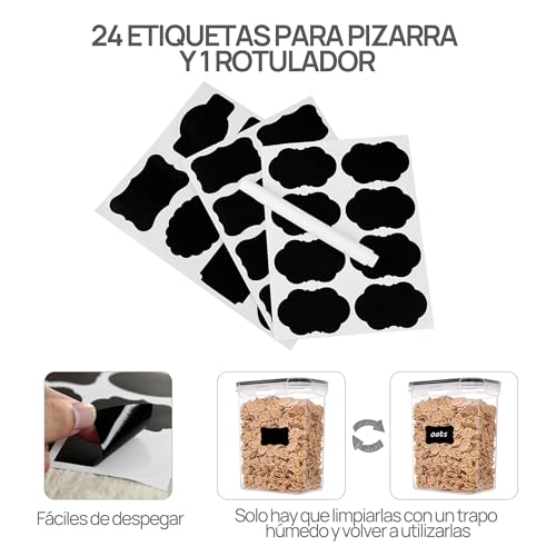 24 etiquetas reutilizables: excepto 24 recipientes de almacenamiento de alimentos secos, también recibirás 24 etiquetas. Son reutilizables, puedes cambiar el contenido cuando lo necesites. Simplemente limpia con un paño húmedo para cambiar lo que has escrito, despegar y volver a pegar.