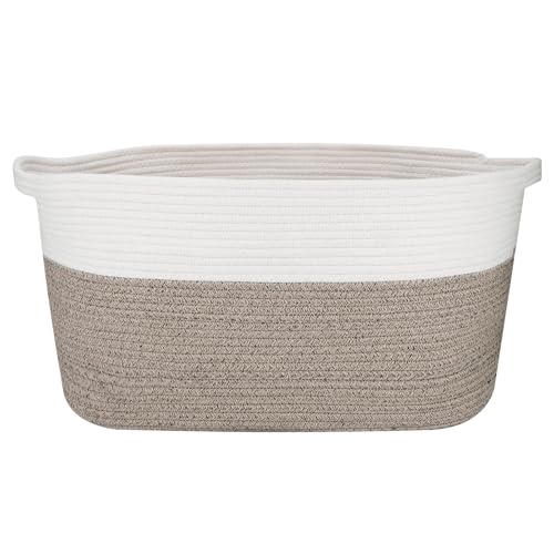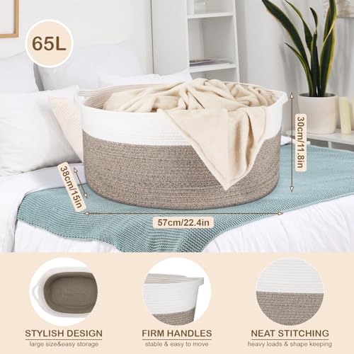 Cesta Guardar Mantas, 65L Grande Cesta para Ropa Sucia Bebe, Plaza Cesta Mimbre Grande, Cuerda de Algodón Cesta Juguetes Infantil, 57x38x30cm Cesta para Mantas Salon Blanco y Caqui