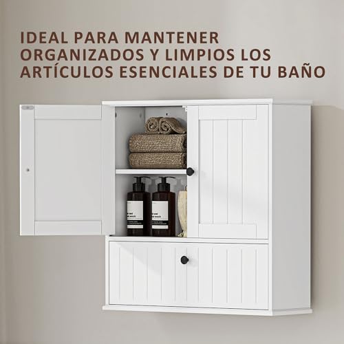 ESTILO GRANJA ACOGEDOR: Con paneles de tablillas clásicas, pomos negros elegantes y acabados angulares en la cornisa y la base, este mueble de baño colgar aporta un encanto rústico y cálido que realza cualquier espacio con un toque natural y decorativo
