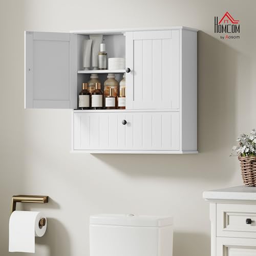 HOMCOM Armario de Baño de Pared, Mueble de Baño Colgar Rústico con Estante Ajustable, Doble Puerta, Puerta Abatible y Cierre Magnético, para Cocina, Lavadero, sobre el Inodoro, Blanco