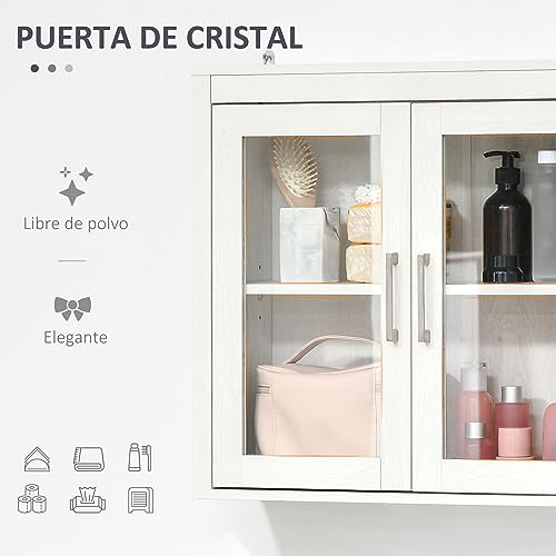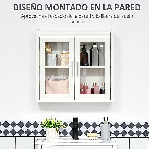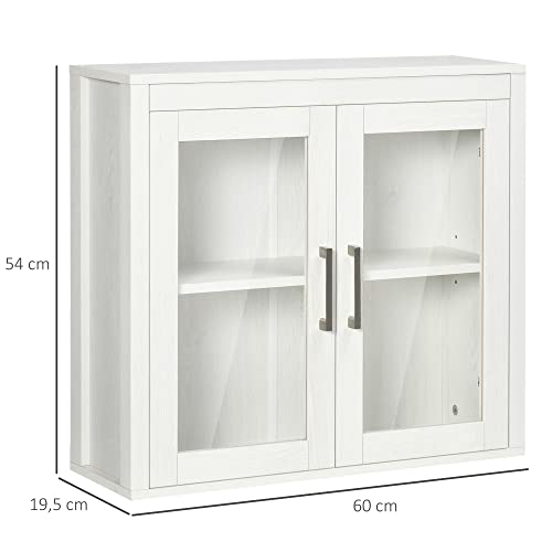 kleankin Armario de Baño de Pared con 2 Puertas de Vidrio y Estante Ajustable Mueble Colgante de Baño para Cocina Dormitorio Aseo Estilo Moderno 60×19,5×54 cm Blanco