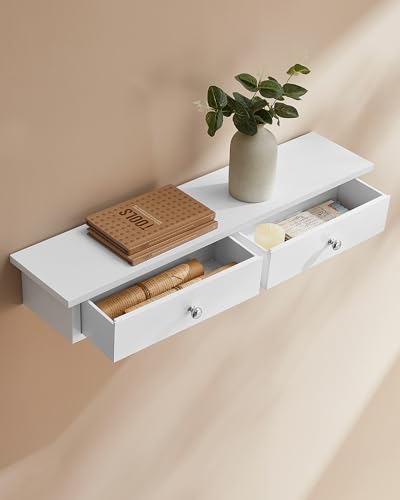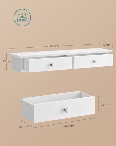 SONGMICS Estantería de pared flotante con 2 cajones, acabado brillante, puede contener hasta 15 kg, 65 x 15 x 10 cm, pasillo, sala de estar y cocina, blanca LWS65WT, madera
