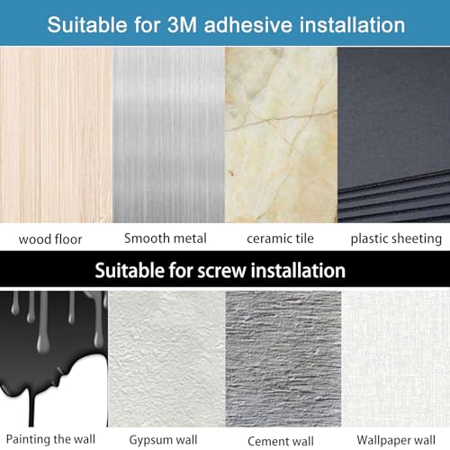 Dos métodos de instalación: Este producto viene con tornillos y tiras adhesivas de doble cara, tiene 2 métodos de instalación diferentes para elegir. El método de instalación con perforación se puede utilizar en superficies rugosas como paredes de madera y paredes de hormigón, y el método de instalación autoadhesivo se puede utilizar en superficies lisas como azulejos, vidrio y mármol. Puede elegir según sus preferencias.