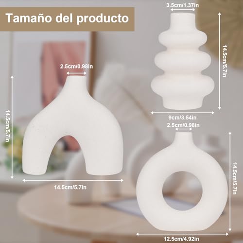 【Jarrones de cerámica blanca únicos】A diferencia de los jarrones tradicionales, nuestro juego de tres jarrones pequeños presenta formas innovadoras: donut, redondo y triple anillo. Cada pieza es única, moderna y añade un toque de estilo minimalista contemporáneo a su decoración. Convierta estos exquisitos jarrones en parte esencial de su colección decorativa.