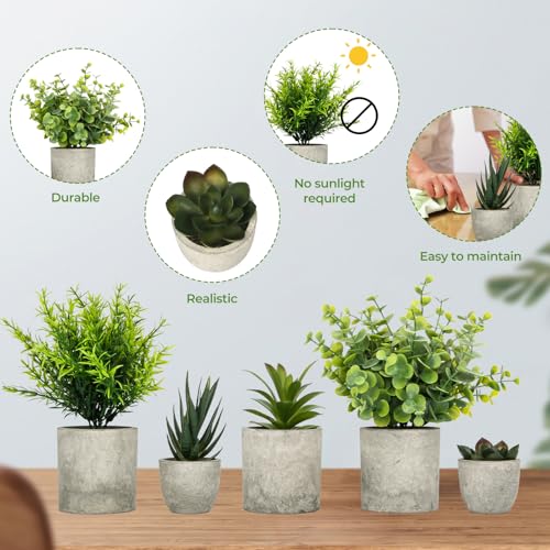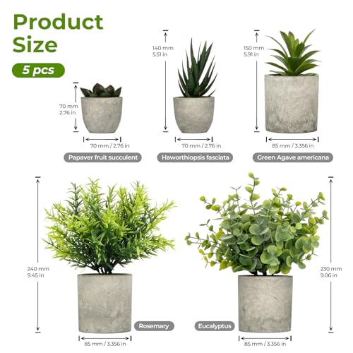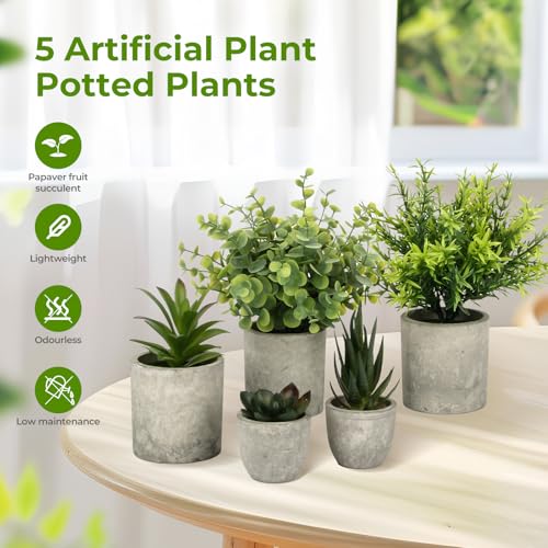 5 Piezas Plantas Artificiales Decorativas, Plantas Artificiales en Maceta, Fake Plants de Plástico que Contienen Eucalipto, Romero, Suculentas, para Bodas, Oficinas, Balcón, Baño, Jardín