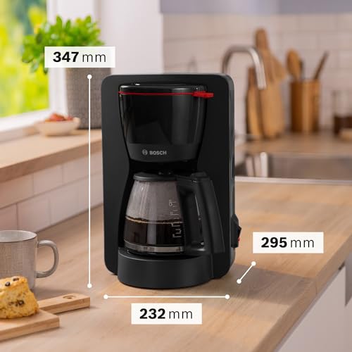 Bosch – Cafetera de Goteo, Jarra de Cristal Ergonómica, Depósito de Agua Extraible, Filtro Extraible, Apagado Automático, Anti Goteo, Negro, TKA2M113
