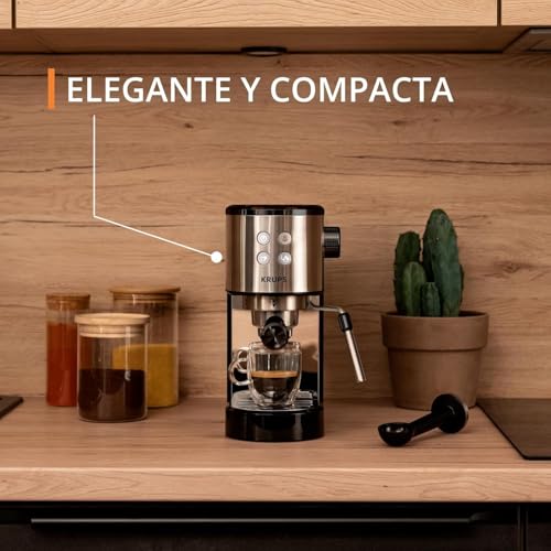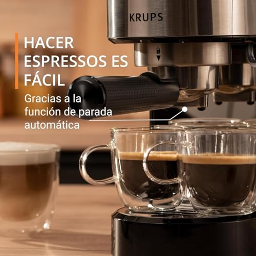 Krups Virtuoso Essential – Cafetera espresso 15 bar, acero inox negro, diseño compacto y elegante, parada automática, espresso y cappuccino, Thermoblock, boquilla de vapor, incluye cuchara, XP4418