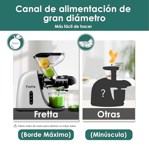 【Diseño Y más Seguro】El tubo de alimentación de los exprimidores Fretta cuenta con un diseño Y seguro, diseñado específicamente para prevenir la inserción accidental de la mano y minimizar el riesgo de lesiones.