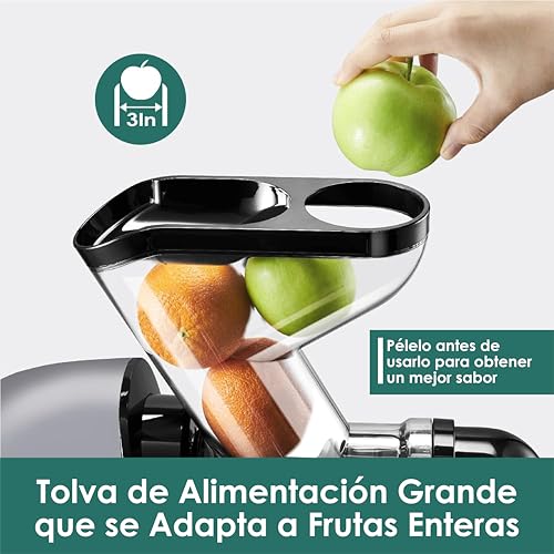 【Tubo de Alimentación Extra Ancho】El exprimidor lento Fretta cuenta con un tubo de alimentación de 3 pulgadas de ancho, lo que facilita el jugo de piezas grandes de frutas y verduras sin la molestia de cortar. Al minimizar el picado, el jugo se oxida menos, preservando su contenido nutricional. Consejo: este exprimidor no elimina automáticamente las cáscaras de frutas, por lo que se recomienda quitarlas antes de exprimir para un mejor sabor.