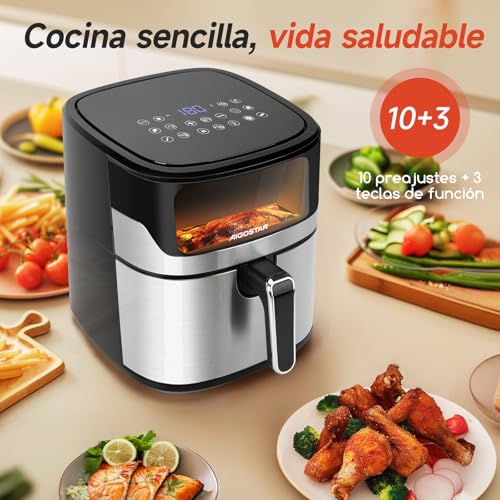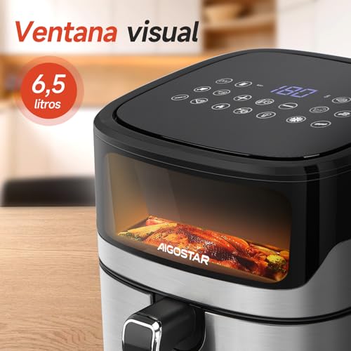 Aigostar Freidora de Aire 6.5L, Freidora sin Aceite con Ventana, 10 programas, Pantalla Digital Táctil, Precalentamiento Inteligente, Descongelación, DIY, La luz es controlable, Acero Inox. Balloon