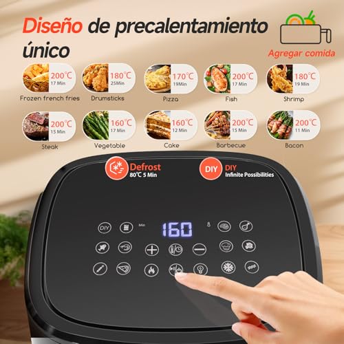 【13 programas preestablecidos】La air fryer tiene 10 menús preestablecidos (patatas fritas congeladas, muslos de pollo fritos, pizza, pescado, camarones, filete, verduras, pasteles, barbacoa, tocino) y 3 menús especiales: bricolaje, precalentamiento y descongelación, lo que le permite disfrutar de una experiencia culinaria cómoda y deliciosa con solo pulsar un botón, al tiempo que conserva a la perfección el sabor original de los ingredientes.