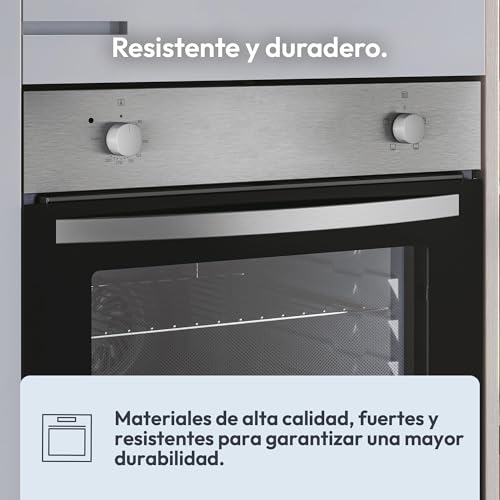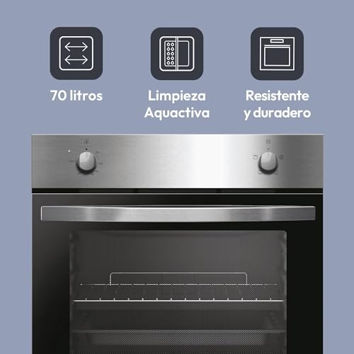 Uso sencillo: Horno eléctrico que encaja de manera óptima con cualquier tipo de cocina. Cuenta con una puerta de doble cristal, 2 mandos y un tirador de acero inoxidable, además de tener una capacidad 70L.