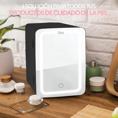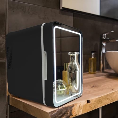 Olvy Mini Nevera Cosmética de 4 Litros, Frigorífico Portátil con Espejo LED, Mini Frigorífico para Cuidado de la Piel, Enfría y Calienta, para Dormitorio, Negro