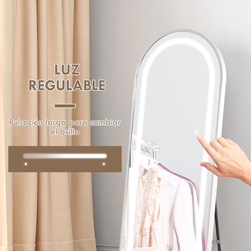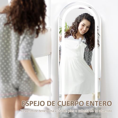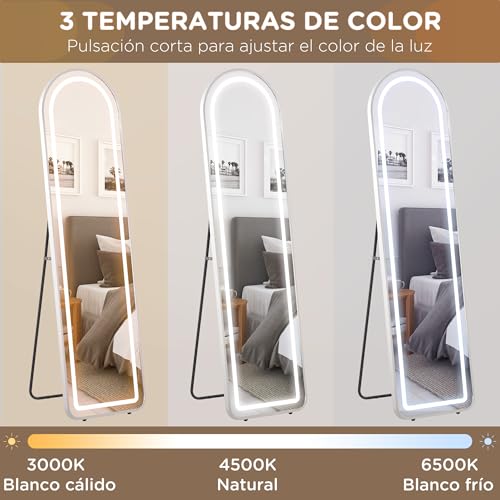 ILUMINACIÓN AJUSTABLE: Equipado con luces LED regulables, el espejo de pie cuerpo entero ofrece tres temperaturas de color (blanco cálido, natural y frío), todas controlables a través de un práctico botón táctil que también cuenta con función de memoria
