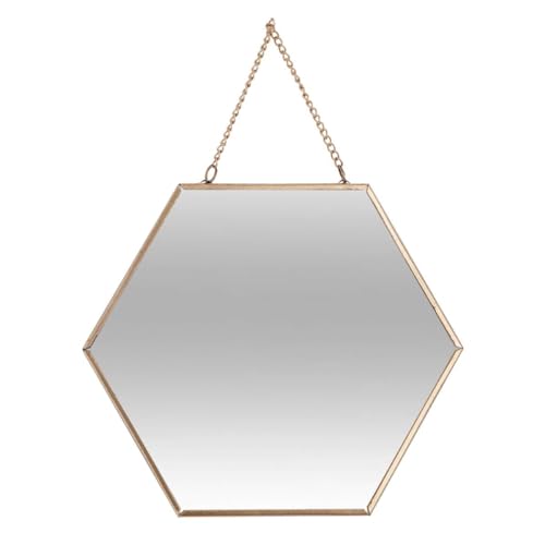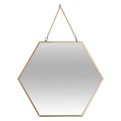 Juego de espejos exagonales Atmosphera. Con estos espejos tendras una decoración de pared original. El espejo exagonal cuenta con una cadena y un marco de múltiples acabados para un estilo contemporáneo. Dispone de 3 formatos para crear más amplitud. Perfectos para tenerlos colgados. Color oro. Fabricados en metal y vidrio. Dimensiones S: l. 19,8 x A. 17,5 x gr. 05 cm / mango: 7,5 cm M: l. 25 x A. 22,5 x gr. 0,5 cm / mango: 8,5 cm L: l. 29,5 x A. 26 x gr. 0,5 cm / mango: 9 cm