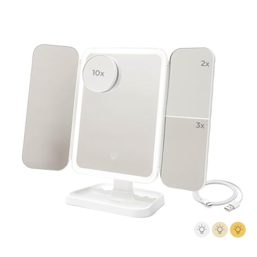 InnovaGoods® Espejo Maquillaje con Luz, tocador LED Triple con Aumento 1X/2X/3X, Recargable, Rotación Ajustable 180°, Inclinación Regulable 90°, Incluye Mini Accesorio (x10)