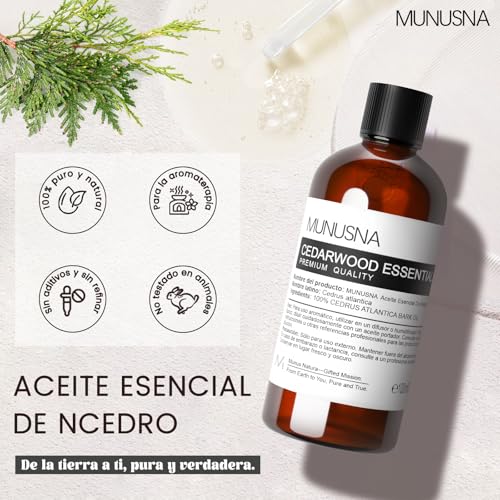 Aceite Esencial Cedro 100ML, MUNUSNA Aceites Esenciales para Humidificador Difusor, Aceite de Cedro Natural Puro para Reparar Cabello, Jabón, Velas, Masaje, Cedarwood Oil