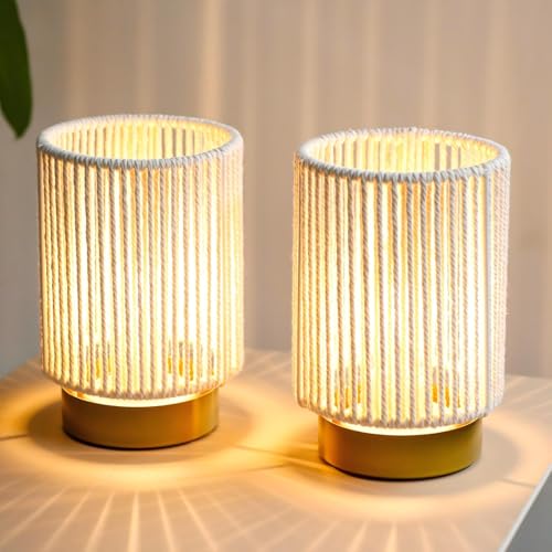 Juego de 2 lámparas de cuerda de algodón trenzada: la moderna lámpara decorativa funciona con pilas, con bombillas estilo Edison y pantallas de cuerda de algodón tejida a mano, creando una estética elegante y simple. Añade un toque espléndido a cualquier espacio con una elegante combinación de belleza y practicidad: un accesorio atractivo para mesas, bares, terrazas, porches; una hermosa decoración para interiores y exteriores durante el día y la noche.