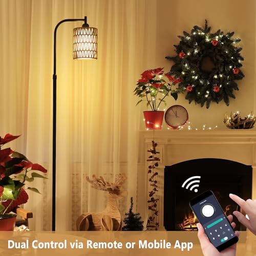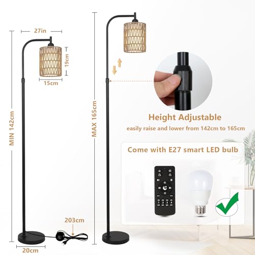 Lámpara de Pie Ajustable Salón, Lámpara de Pie de Ratán con Mando a Distancia, App Control, Lámpara de Pie Boho con Pantalla de Ratán y Lino, Lámpara de Pie para Dormitorio, Altura Ajustable