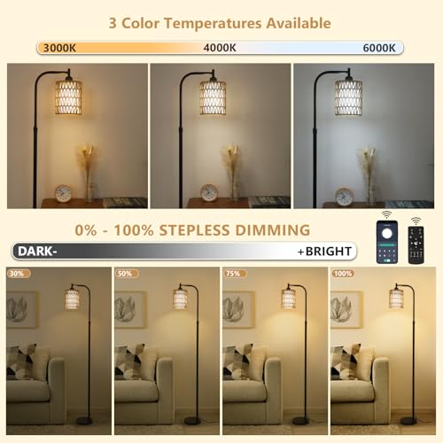 💡【Bombilla de luz regulable incluida y 3 temperaturas de color】Nuestra lámpara de pie de ratán viene con una bombilla de luz LED de 9W que se puede ajustar el brillo de 0-100% y 3 configuraciones de temperatura de color de 3000K-6000K según sea necesario; Esta lámpara de pie regulable también tiene modos preestablecidos que pueden establecer diferentes escenas, tales como: Lectura, Guardería, Trabajo y Luz nocturna. La función de memoria puede ayudarle a recordar el último ajuste.