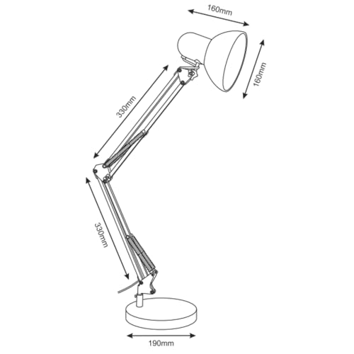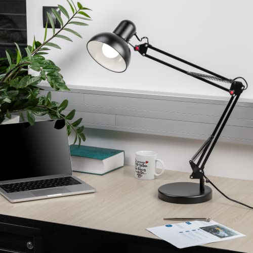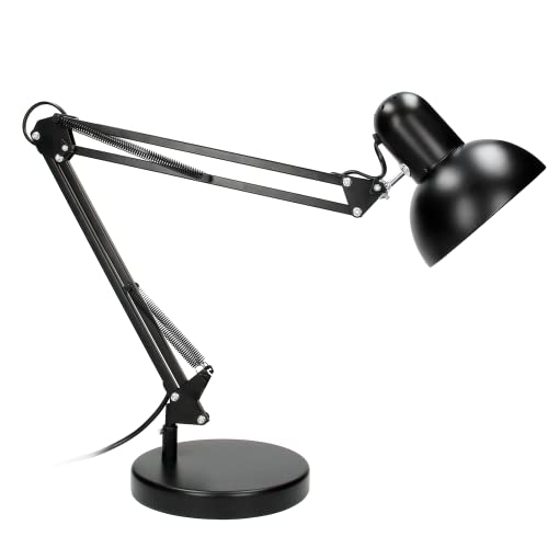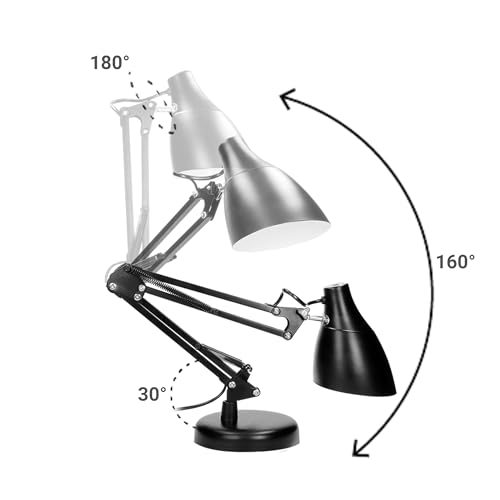 Lámpara tradicional con brazo oscilante que permite dirigir el flujo de luz desde muchos ángulos diferentes. Su pantalla y base giran 360 grados y el basculante con resortes permite el ajuste de altura para adaptarse mejor a las preferencias del usuario. Gracias a la pantalla y al aplique de metal, así como a la base pesada, la lámpara se mantiene firme y no se desliza sobre la superficie del escritorio. Disponible en colores: blanco o negro.
