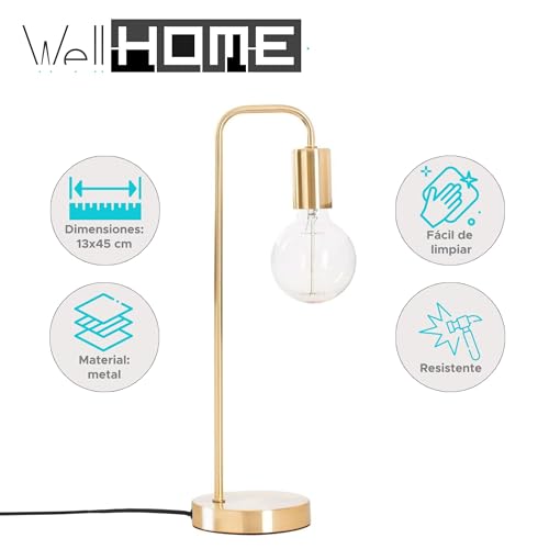 Se el primero en opinar sobre “WELL HOME MOBILIARIO & DECORACIÓN Lámpara de mesa retro curvada L dorada I E27 I cable con interruptor I metal I lámpara de lectura redonda”