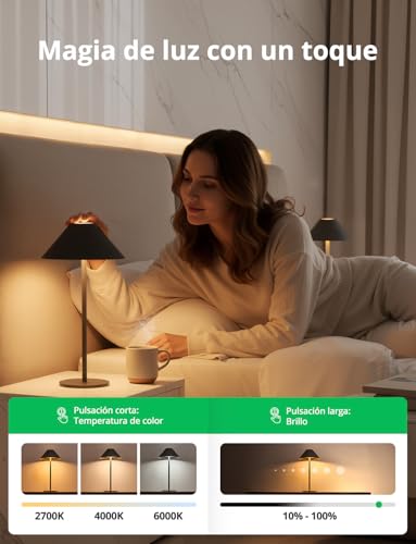 Control Táctil Intuitivo: Funcionamiento táctil intuitivo: toca para encender/apagar y cambiar entre los 3 colores de luz (cálido/neutro/frío). Mantén presionado para regular el brillo de forma continua. Ajuste sencillo para cada estado de escena.