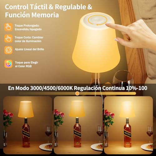 Lámpara de Mesa Inalámbrica, Lámpara de Botella Recargable, Lámpara de Noche Brillo Ajustable 3 Temperaturas Color+RGB, Botón Táctil IP54 Impermeable para Restaurante,Cafetería(Sin incluir Botellas)