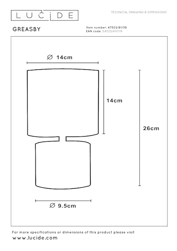 Comodidad y estado de ánimo. Greasby es un maestro en la generación de estos. La encantadora lámpara de mesa tiene un aspecto claro y una excelente salida de luz. El resplandor natural de Greasy se ve en todas partes. En el mueble de TV, en la mesita de noche o como punto de atracción en tu tocador: Greasby se integra perfectamente en cualquier habitación. Con una altura modesta, la lámpara de mesa proporciona un ambiente acogedor. Usted se beneficia todos los días. Características únicas del producto: adecuado para su uso con una fuente de luz LED Interruptor de encendido/apagado en el cable Hecho de cerámica. Características del producto: Consumo de energía: 1 x 40 W / 230 V / A++ – E (excl. ) – No Dimmbaar Tamaño: Ø14 cm H. 26 cm 2 años en la lámpara/fuente de luz adecuada es SKU: 49022/04/67Recomendación! Compre esta lámpara junto con la fuente de luz adecuada. Código artículo: 49022/04/67Para los mejores efectos de iluminación y resultados.