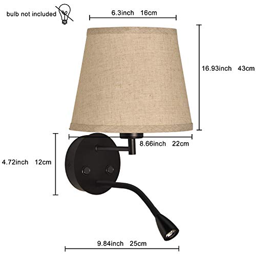 Barcelona LED – Aplique de pared PAIR. Lámpara de pared Casquillo E27 con Flexo Foco de Lectura Orientable 3W. Pantalla textil e interruptor para Dormitorio Cabecero Cama Salón