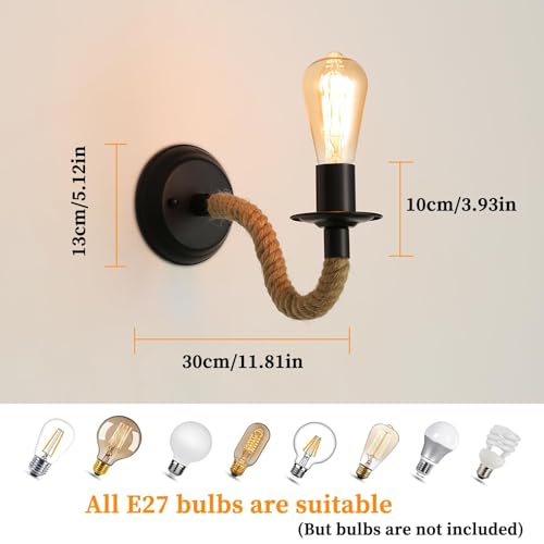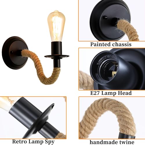 Comely 2 Piezas Apliques de Pared Vintage, Lampara de Pared Cuerda de Cáñamo, E27 180° Ajustable Lámpara de Pared para Pasillo Desván Dormitorio Café Restaurante (No Incluye Bombilla)