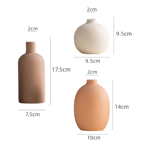 Tamaño del juego de 3 jarrones de cerámica: El juego de 3 jarrones de cerámica incluye tres tamaños diferentes: 7,5 cm de ancho x 17,5 cm de alto, 10 cm de ancho x 14 cm de alto y 9,5 cm de ancho x 9,5 cm de alto.