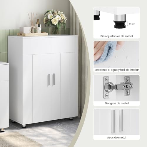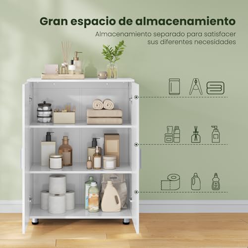 Gran Espacio de Almacenaje: Con una enciemra amplia y 3 compartimentos, el mueble auxiliar de baño ofrece espacio suficiente para guardar artículos de aseo, cosméticos y toallas. Con este armario de baño, tendrá un cuarto de baño limpio y ordenado. Las puertas con bisagras metálicas son fáciles de abrir, al tiempo que protegen su intimidad