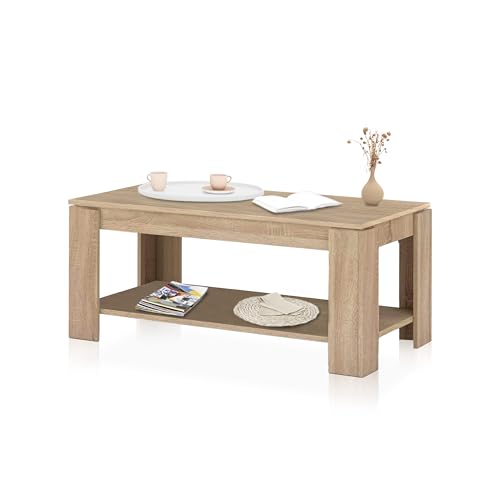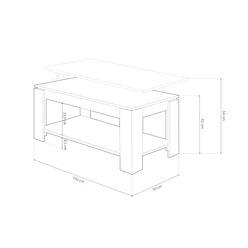 Medidas de mesa elevable: 102 cm (largo) x 50 cm (ancho) x 43-54 cm (alto); Mesa de centro con doble altura y espacio de almacenaje, una mesa resistente y funcional.