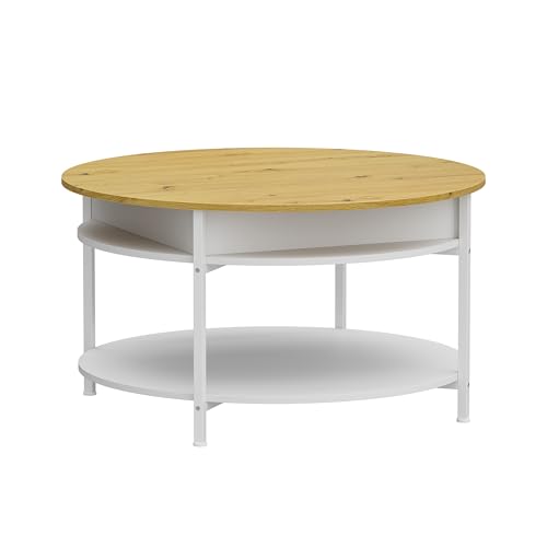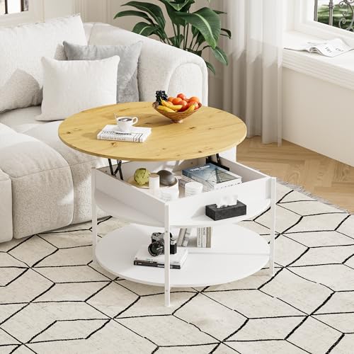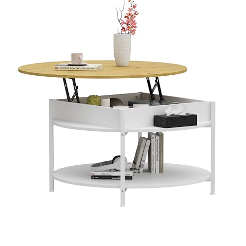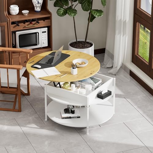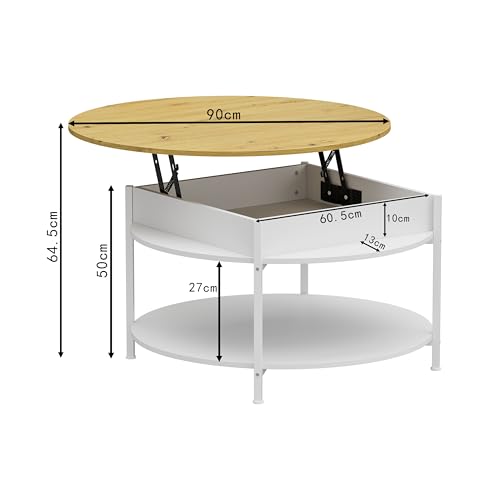 HOGAR24 ES – Mesa de Centro Redonda Elevable con Almacenaje Oculto Color Blanco y Madera, Medidas: 90×90 cm – Mesa de Café Convertible en Escritorio con Estante Inferior.