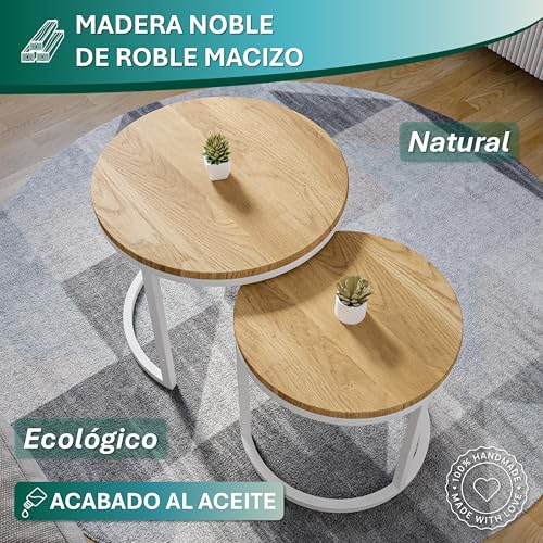 Modena, Juego de 2 Mesas de Centro de Madera Maciza de Roble Natural y Acero, Hechas a Mano en Europa, Mesas Auxiliares, Mesas para Sofá, Blanco, Redondo, Ø50×43 cm / Ø40×38 cm
