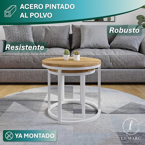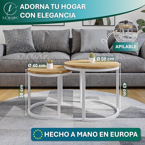 ELEGANTE Y FUNCIONAL: El conjunto incluye 2 mesas de centro con dimensiones de 50 x 43 cm y 50 x 43 cm (Diámetro x Altura). Gracias a su diseño versátil, se adaptan perfectamente a cualquier espacio interior y ofrecen un equilibrio ideal entre estilo y funcionalidad.