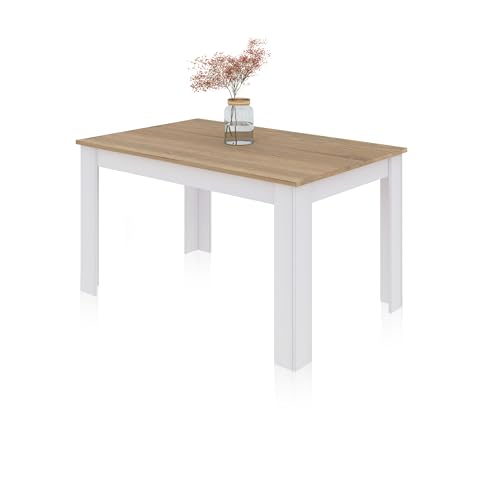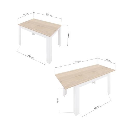 duehome | Mesa de Comedor Extensible, Mesa Rectangular, Modelo Danna, Acabado en Blanco Artik y Roble Canadian, Medidas: 123-173 cm (Largo) x 75 cm (Ancho) x 78 cm (Alto)