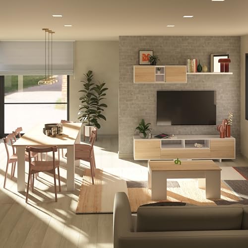 Mesa de gran robustez, formas simples y rectas, ideal para comedores actuales, acabada blanco mate y roble claro. Fabricada con aglomerado de alta densidad, melamina de calidad y de larga durabilidad.