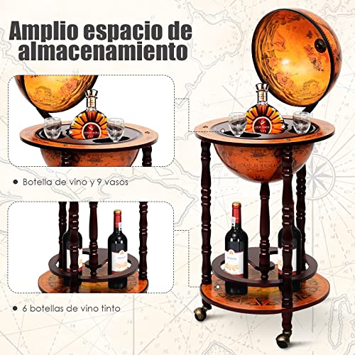 COSTWAY Globus Bar de Madera, Barra de Globo, con Ruedas, Carrito de Bar, Bar, botellero 45 x 45 x 88 cm, marrón, Aprox. 45 x 45 x 88 cm (Largo x Ancho x Alto)