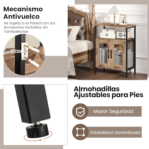 Este gabinete incluye un dispositivo antivuelco para fijarlo a la pared y evitar vuelcos. Su construcción robusta soporta grandes cargas, y las patas ajustables aseguran estabilidad. La puerta de malla metálica permite una buena ventilación, lo cual es importante para el almacenamiento seguro de ciertos artículos. Siga las instrucciones de montaje proporcionadas para una instalación adecuada y segura.