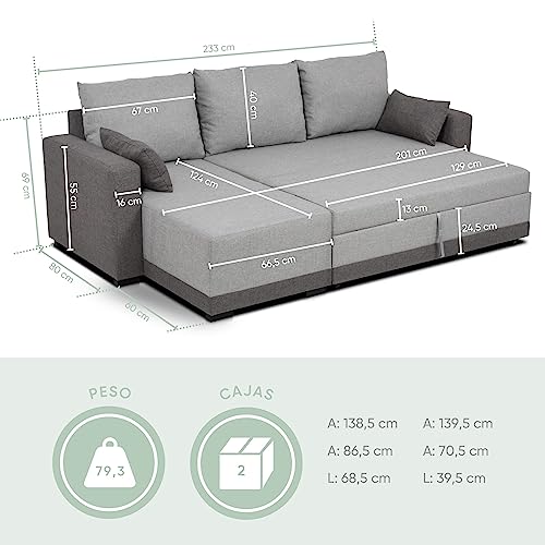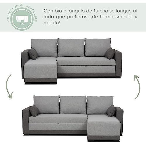 BUDWING Leah Sofá Cama Esquinero 3 Plazas – Chaise Longue Reversible y 2 Cojines Decorativos – Tapizado en Poliéster – Estilo Moderno – 233x124x69 cm – Gris Bicolor