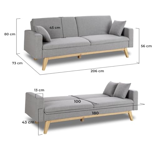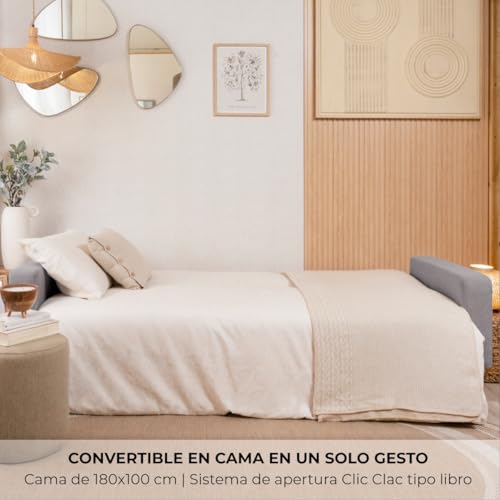 Don Descanso, Sofá Cama 3 plazas Reine, Tapizado en Tela, Sistema Apertura de Libro o Clic-clac, Medida sofá: 206x73x80cm, Medida Cama: 180x100cm, Incluye 2 Cojines, Gris Claro