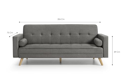 Sofá cama de diseño de 3 plazas. combinando sencillez, elegancia y confort. El asinto es para 3 plazas, cama de 2 plazas. Incluye 2 cojines del mismo color y tejido que el sofá. Fabricado con materiales de calidad con estructura y patas de madera de gran resistencia. Medida sofá: 206 x 75 x 89 cm (largo x fondo x alto). Medida cama: 206 x 107 x 43 cm (largo x fondo x alto). Sistema de apertura clic-clac multi-posición: muy fácil y cómodo de transformar, se convierte en cama con un sólo gesto. Gracias a su mecanismo de apertura clic-clac tipo libro, permite poner el respaldo a la altura del asiento sin apenas esfuerzo y convertirlo en una cómoda cama. además, como sofá, puede elegir entre diferentes ajustes de reclinación para el respaldo. Montaje rápido y sencillo: el sofá cama se entrega montado, sólo hay que instalar las patas.