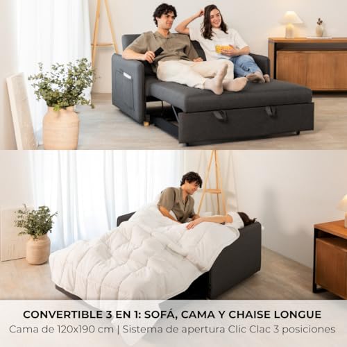 SOFA CAMA 2 PLAZAS 139x100x80cm CONVERTIBLE EN CAMA 120x190cm. Convierte el sofá en cama con tan solo un clic y disfruta del máximo confort gracias a su cómodo asiento acolchado en ComfortSoft 22HD de tacto agradable y termorregulador para evitar el exceso de calor y frío. Medida sofá cerrado: 139x100x80 cm; Medida con Chaise longue abierto: 139x190x80 cm; Medida cama: 190x120x43 cm