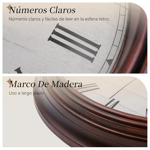 [ Diseño Retro Atemporal ]: Reloj de pared 30x30x4,5 cm con Números romanos grandes y marco de plástico efecto madera en tono marrón, perfecto para estilos rústicos, vintage o clásicos.